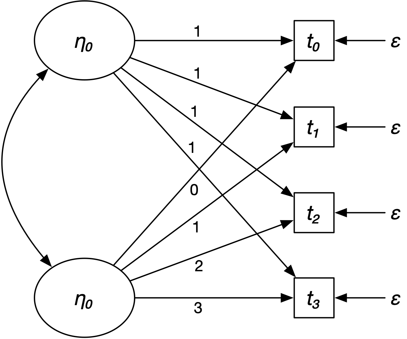 Figure: path diagram of an SEM latent growth model, for 4 time points, with subject/case-varying constant and linear coefficient.